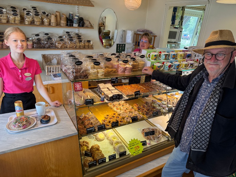 Eftersom det var lunchdags gick vi till Condis där Peter bjöd på en köttbullsmacka och en Champis och så hann vi prata en stund eftersom jag låg bra till med tidsschemat. Condis i Tidan är ett klassiskt fikaställe och det var rätt mycket folk där och många satt ute i det fina vädret. 21 grader och sol.