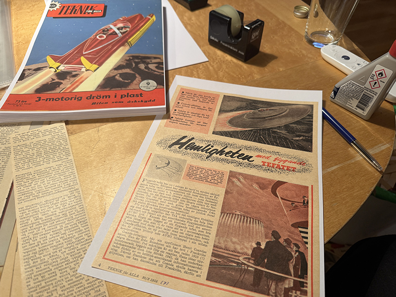 I dag har jag fortsatt att klistra in artiklar som blivit liggande. Och det är många det. En av högarna var äldre nummer av Teknik för alla som hade många artiklar om rymdfart men också en del om ”flygande tefat” på 1940- och 50-talet.
