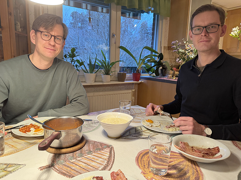 Strax före 15 kom Niklas och Markus för att äta middag och prata lite innan de skulle vidare på Alex och Sigges show. En julklapp som Niklas fick av mig och Anneli. Nu svängde vi ihop lite enkel mat men Niklas satsade lite högre och gjorde en riktigt bra löksås till stekfläsket som åts med vita bönor och ägg.