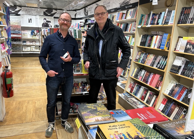 När vi hade testat ljud och allt annat gick jag och Anders på en italienska restaurang för att han skulle få en bit mat i magen. Och vi slank in på Akademibokhandeln som fortfarande ägs av Killbergs. Jag ville prata med den ansvarige där (Kim Johansson) om min bok ”Mötet i gläntan” eftersom jag visste att de ville köpa in ett antal exemplar. Och det ville de. Men tyvärr är boken slutslut så om de vill köpa måste vi trycka nya…