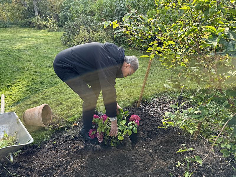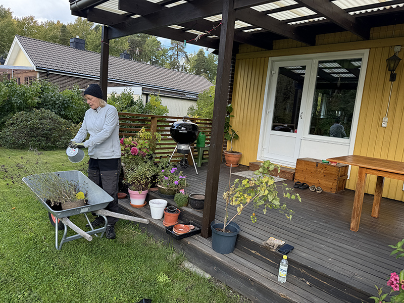 Men sedan gick jag och Anneli ut i trädgården för att stänga den för hösten. Anneli jobbade med att ta bort blommorna från verandan och några grävde vi ned i landet, andra hamnade i komposten. Jag rensade ogräs och grävde.