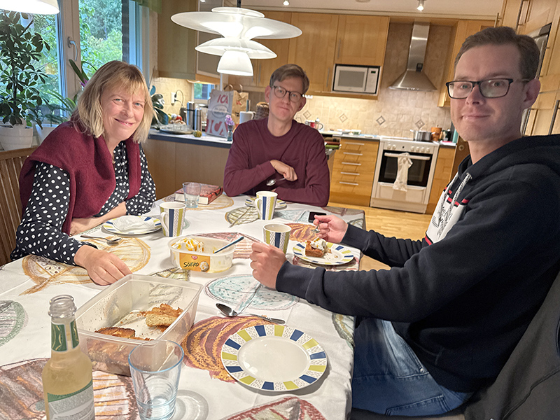 Markus ska ha egna gäster men kom förbi för att låna en del glas och för att fika äppelkaka med glass.
