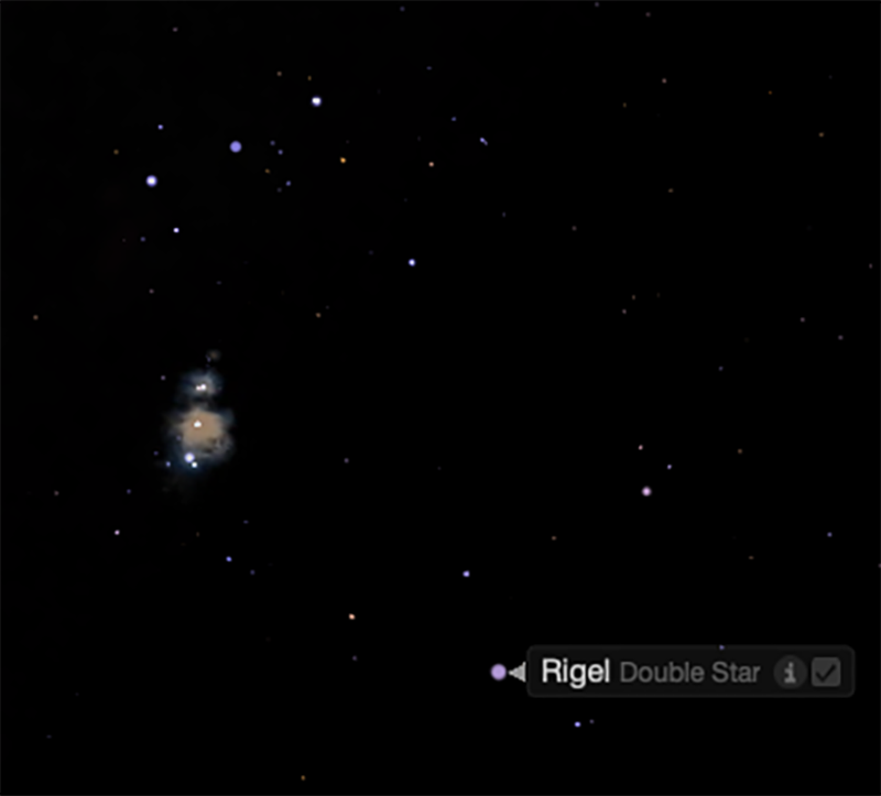 Det var inte svårt att känna igen stjärnan Rigel som ingår i stjärnbilden Orion. Och tittar ni på kartan ur Starry Night här ovan så ser ni också de två stjärnorna strax över till vänster om Rigel som exakt matchar stjärnorna på Robert Karlssons bild. Ingen tvekan alltså.