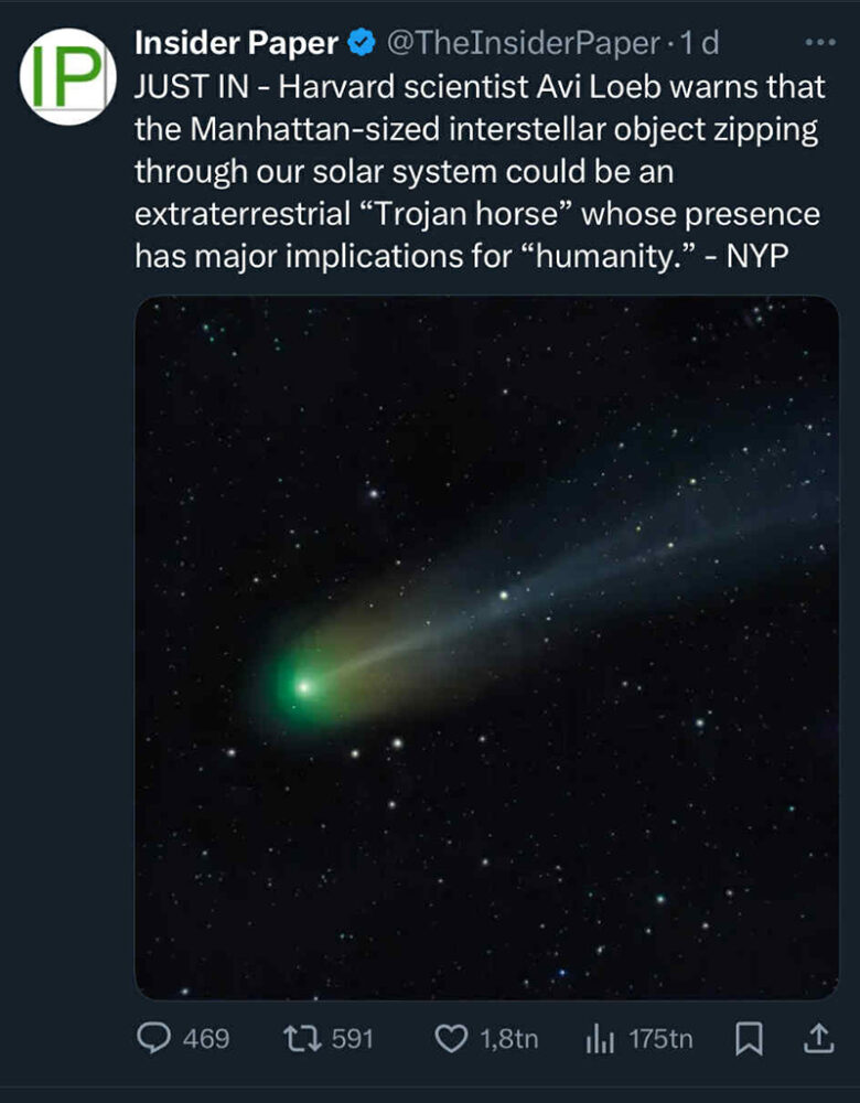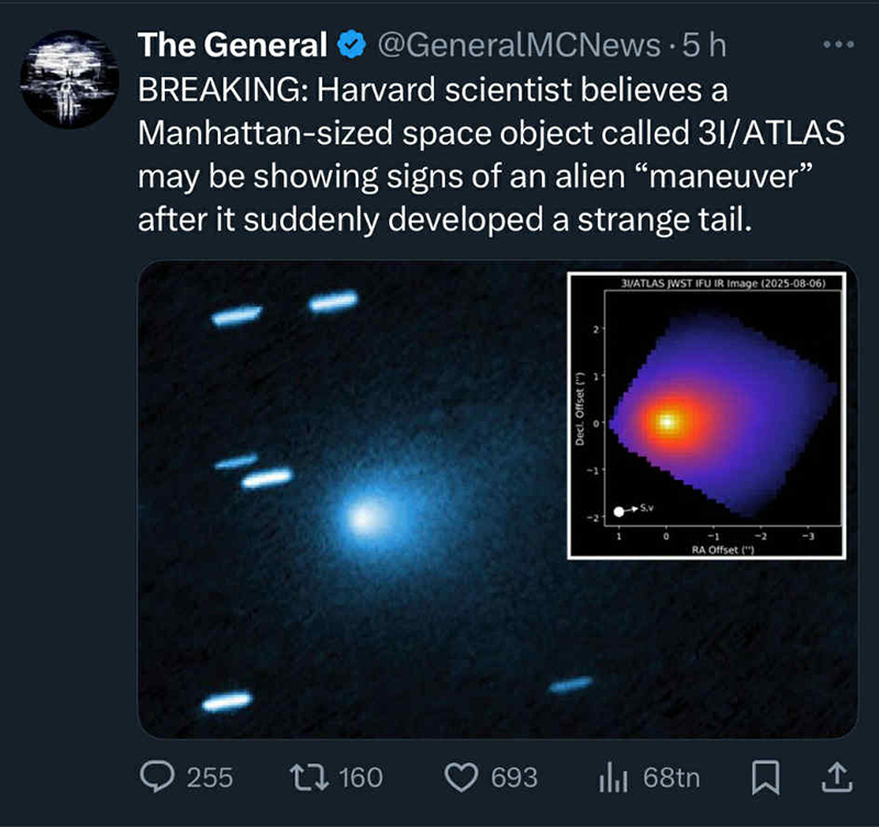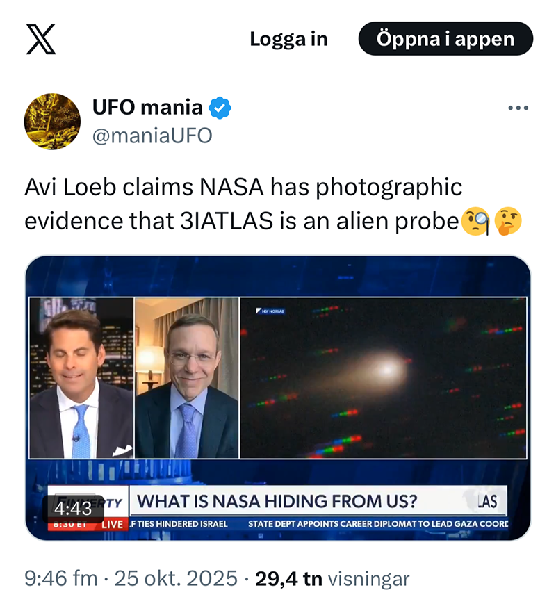 Just nu sprids ett rykte på sociala medier om att professor Avi Loeb skulle ha påstått att 3I/Atlas skulle vara en farkost från en annan planet och att Nasa inte lämnar ut några bilder eftersom de vill dölja detta. Flera personer har hört av sig till mig om detta. Men när jag skriver till Avi Loeb och frågar om han verkligen sagt så svarar han direkt att detta är ett rent påhitt. Och lyssnar man på inslaget så ser man att det stämmer men eftersom Avi Loeb som vanligt är otroligt spekulativ och pratar om att det skulle kunna vara ett ”moderskepp” som kan skicka ut mindre farkoster så fattar jag att många går i spinn och inte tar till sig fakta.