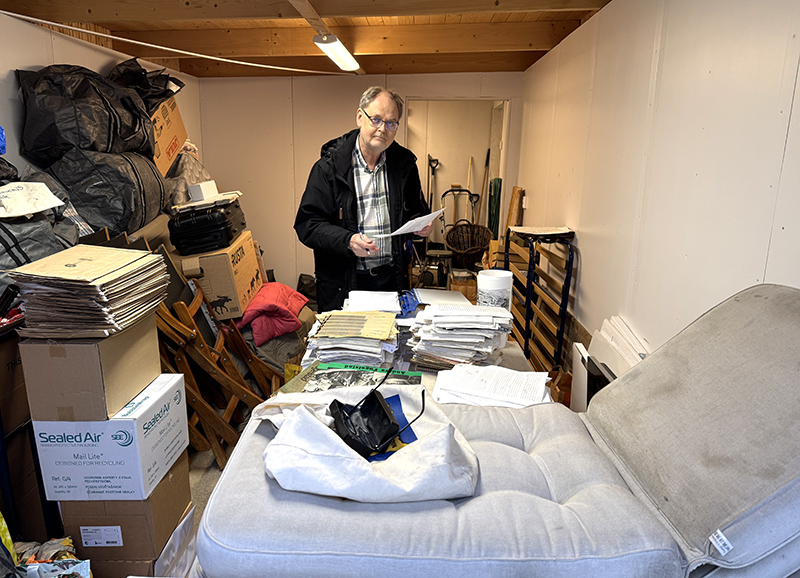 Jag jobbade i alla fall på en stund med de saker jag fått med mig hittills så jag stod i garaget när Anneli kom tillbaka hem efter en gångtur och då tog hon bilden överst. Detta har varit ett försök till ordningens dag då jag har sorterat en del digitalt material och rätt mycket papper. Men jag ligger fortfarande efter ordentligt där.