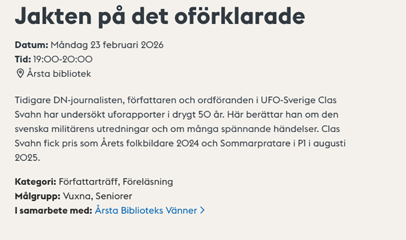 Ser också att Årsta bibliotek nu har börjat annonsera om mitt föredrag där den 23 februari. Har ni vägarna ditåt så titta gärna in.