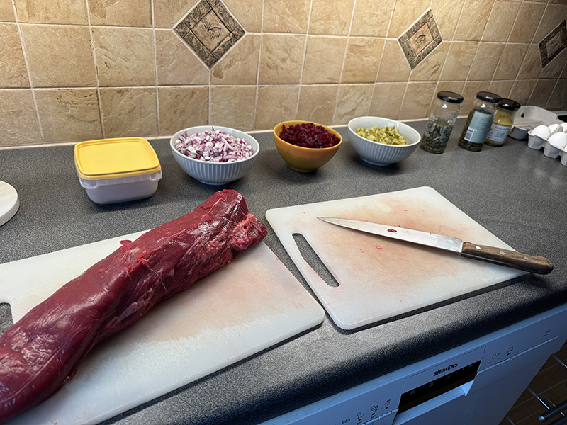 Framåt eftermiddagen kom Ylva och sedan hämtade jag Niklas, Fred och Björn vid pendeln innan Markus anslöt direkt efter jobbet. Då hade jag förberett och hackat alla tillbehör (och mortlat svartpepparen) som vi behövde till råbiffen och någon timma senare skrapade och hackade jag själva oxfilén också. Mycket jobb men bra blev det.
