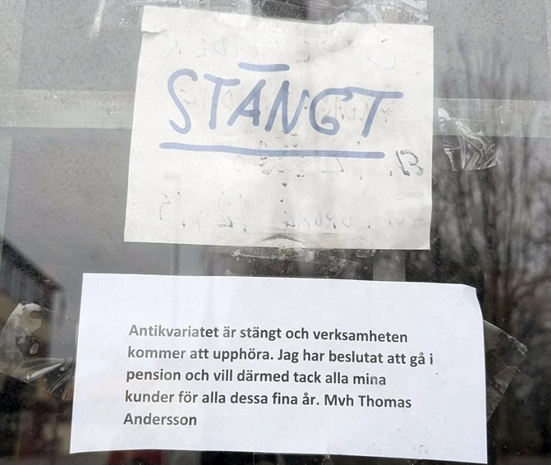 Tråkigt att ännu ett antikvariat försvinner. Nu blir det bara två kvar: Fantastikbokhandeln och Röda rummet. Inte bra att det blir färre antikvariat eftersom det gör det svårare för mig att sälja och att utbudet också blir smalare.
