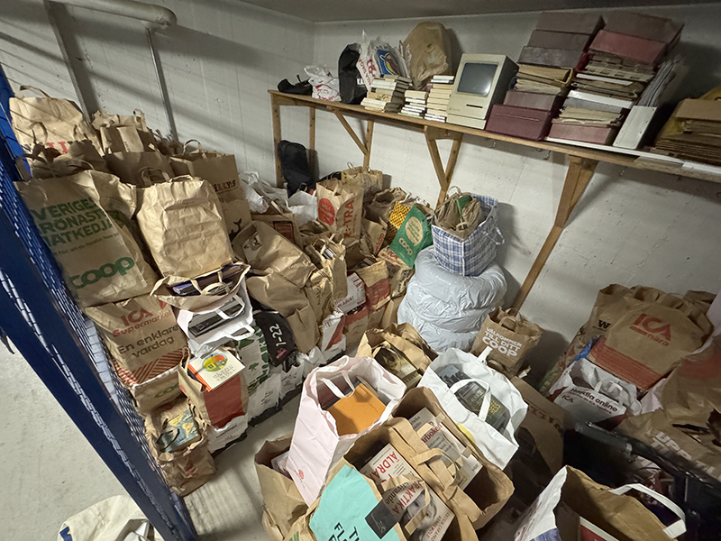 När Björn gett sig av hem började jag bära upp alla kassar som ska till Röda rummet i sinom tid och som har stått bredvid trappan som går ned till nedervåningen. Nu är golvet tomt på böcker. Packade in allt i bilen och körde till Markus förråd där jag gick igenom varje påse, sorterade ut sådant som inte ska till Uppsala och kastade en del, lade annat till Böckernas hus.