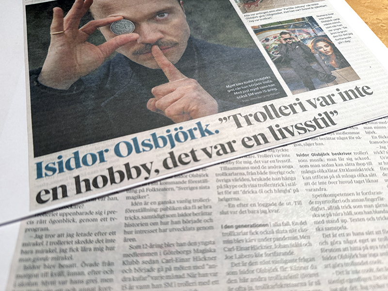 Såg i tidningen att trollerikonstnären Isidor Olsbjörk var intervjuad, så den läste jag med intresse. Isidor kommer ju till årets. fältundersökarkurs. Vi träffades när vi båda var med i ”Sverige live” och deras första lördagssändning.