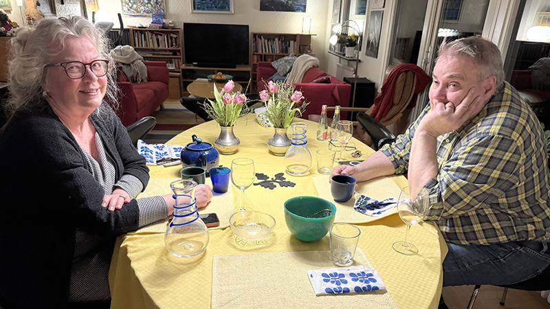 Under dagen hörde Johan Marcopoulos av sig och undrade om jag inte skulle komma över på middag med honom och Ann-Sofie senare på kvällen och det lät som en god idé. Jag behövde något trevligt efter att mitt knä är fortsatt paj och jag givetvis inte ska ägna mig åt att springa i trapport vare sig hemma eller i Markus källare. Men det gjorde jag ändå.