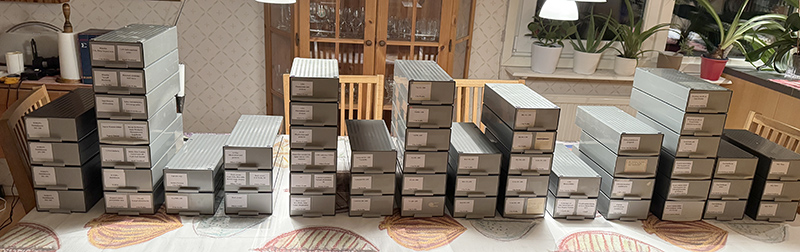 Istället har jag lyckats tömma en stor hög med artiklar som istället för att ligga på golvet nu sitter i prydliga pärmar och så har jag hunnit klart med att märka samtliga lådor med diabilder som jag har här hemma. Alltså sådana som har med ufo att göra. Så nu ska de ner till AFU vid nästa resa dit.