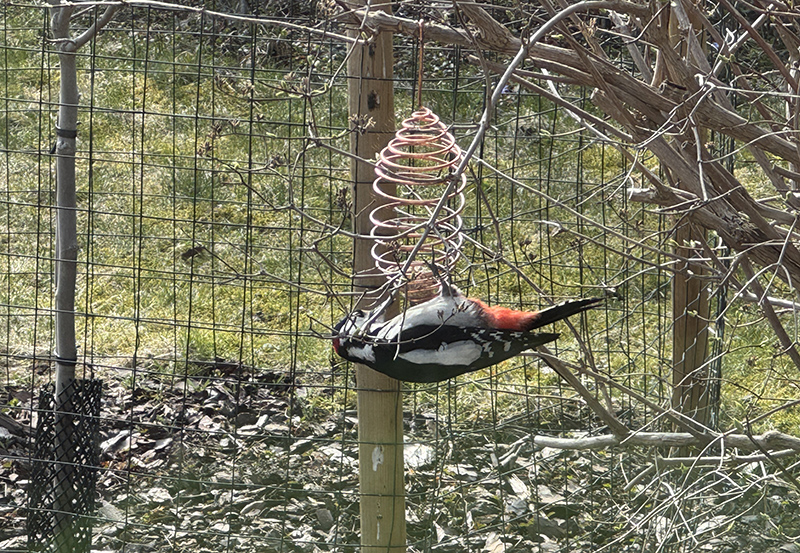 Fåglarna är väldigt glada i de talgbollar jag hela tiden fyller på med och i dag kom hackspetten, som jag och Greger hörde banka på i skogen på förmiddagen, för att äta lite den också. Den kom några varv innan den ersattes av de obligatoriska småfåglarna och koltrasten som skuttar omkring i landet under bollarna och äter tappade frön.