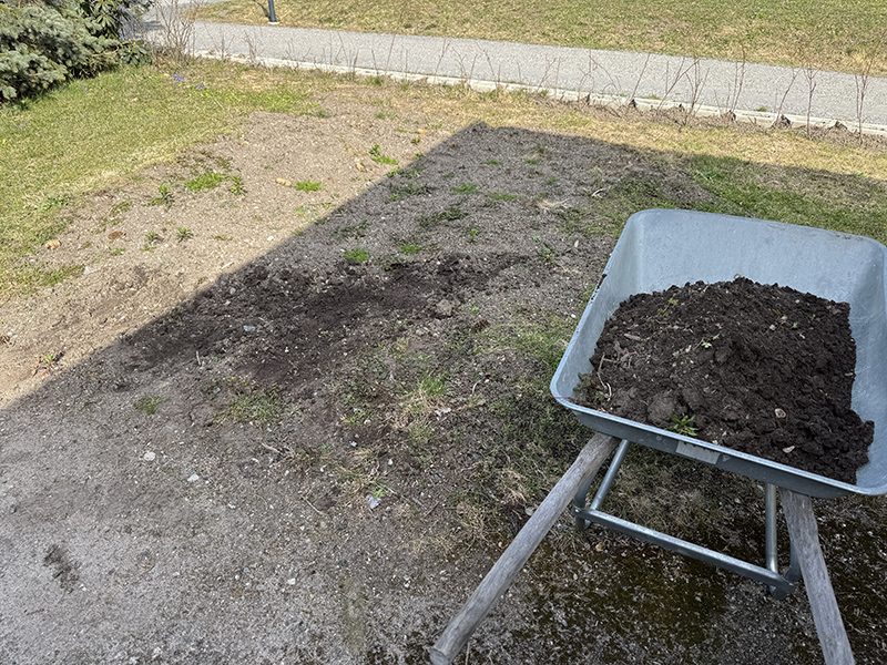 Jag tog mig an den plätten när maten var instuvad i kyl, frys och skafferi. Fram med kratta och sopade och skottkärra. Men efter fyra turer med kärran fick jag ett ordentligt astmaproblem och var tvungen att gå in. Det bara pep i bröstet och hostan ville inte ta slut. Efter en stund var jag tvungen att ta dubbla doser med min inhalator och bara sitta ned. Skit också.