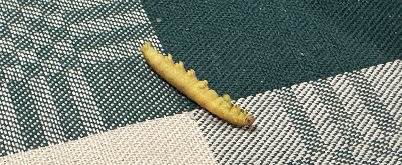 När Anneli kom var hamburgarna klara och broccolin kokt. Men när Anneli tog upp broccolin från kastrullen så hittade hon en kokt larv också. Stendöd givetvis. Lite trist. Hade jag sett det lilla krypet i tid kunde han fått ett fortsatt liv i vår trädgård.