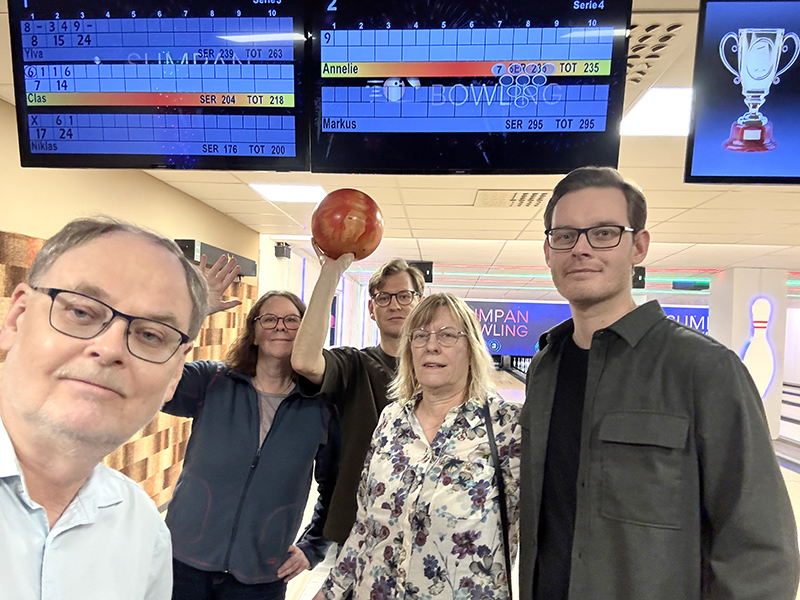 Det var riktigt länge sedan jag spelade bowling och det är ingen sport som jag är särskilt bra på. Senaste var faktiskt den 18 februari 2012, även då med Ylva och hela familjen. Men till min glädje kan jag konstatera att jag bättrat mig sedan dess. För då kom jag sist och i dag trea av oss fem, sett till snittet.