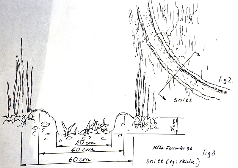 Ringarna liknade heller inte de cirklar i sädesfälten som var populära i början av 90-talet utan var som grävda i marken och där jorden låg i en liten vall runt fördjupningen. Ni kan se hur det såg ut på vår fältundersökare Håkan Fenanders utmärkta ritning här ovan. Som ni kan se hade det börjat växa i ringarna så jorden verkar inte ha påverkats negativt.