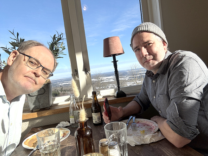 Gustav och jag tog hans bil och körde opp till Högkullen och Kinnekullegården där han bjöd på lunch. En finfin köttfärslimpa och så hann vi prata i kapp oss lite med den vackra utsikten som bakgrund. Tillbaka på antikvariatet lastade vi ur sex kassar med böcker som Gustav började gå igenom medan jag kikade runt och hittade några böcker till AFU.