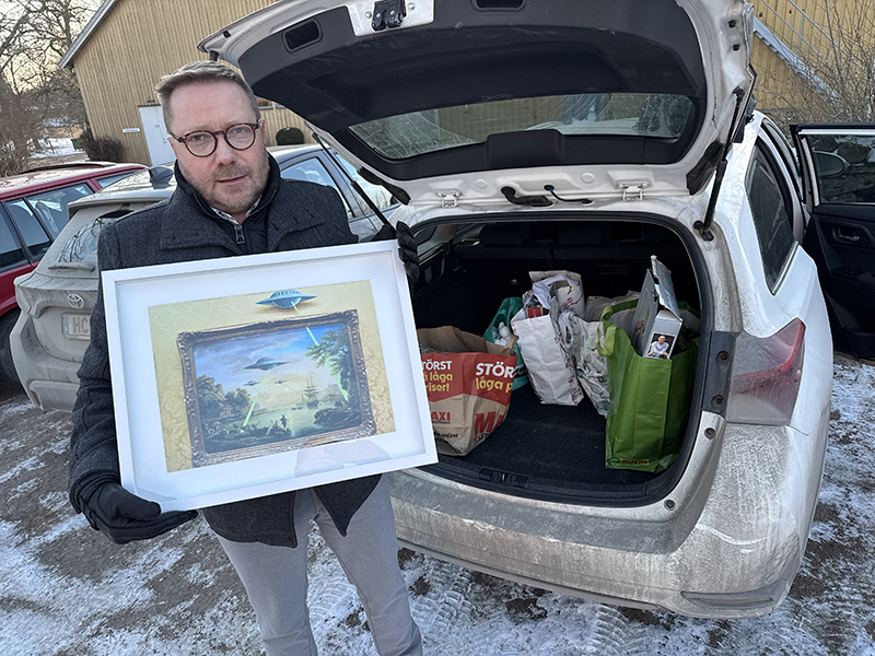 Sedan var det tack och hej. Niklas och jag hade redan tidigare flyttat över allt som han hade fixat till AFU i form av gåvor från hans bil till min. En kul sak var en reproduktion av en Banksytavla med tefatsmotiv som Niklas köpt på auktion. Det som ligger i kassarna kommer till största delen att kunna säljas i en framtida, fysisk, butik, medan annat går in i våra samlingar. Som tavlan.