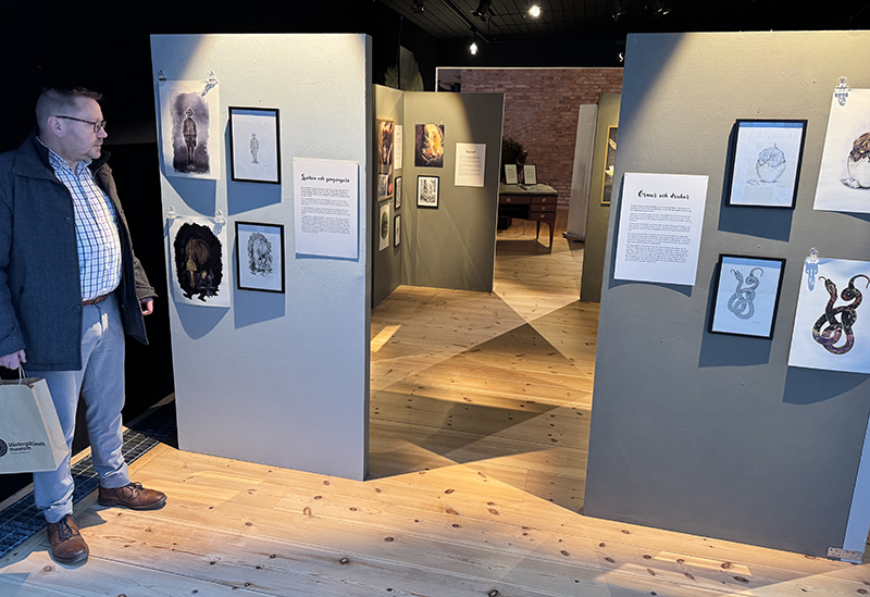 Eftersom vi var i god tid kunde jag testa tekniken i lugn och ro och sedan gå och titta på den lilla utställningen om väsen i Västergötland. Fina illustrationer av Elin Sandström och korta texter av Pontus Kjellberg. Efter föredraget fick jag boken som present! Kul!