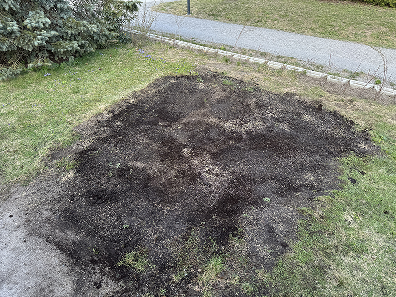 Och så grävde jag bort ytterligare tre skottkärror med jord där vi fick all matjord levererad då vi fixade med häcken förra året. Nu är det hyfsat jämnt och jag har sått gräsfrön och lagt ut ny och fräsch jord på platsen. Sedan vattnade jag och nu hoppas vi att det ska bli gräs där igen.